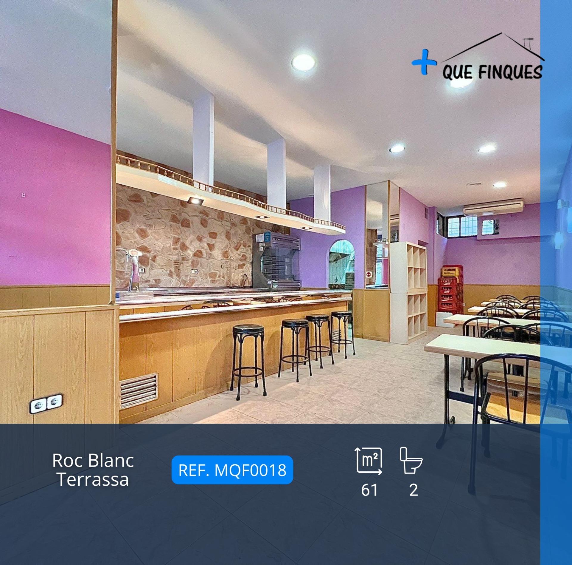 Ref. MQF0018_¡Oportunidad en la Plaça Roc Blanc! ¿Quieres tener tu propio negocio en un local de tu propiedad? ¡Esta es tu ocasión! Ubicado en una excelente zona, rodeado de comercios y con un gran ambiente, se trata de un local de 61 m2, cuyo último uso fue como bar. En el interior, dispone de una sala principal con una barra que la divide, así como una cocina. Al fondo del local se encuentran dos baños.Cuenta con doble persiana, gran iluminación natural, rejas de seguridad y persiana metálica. Se vende con todo el mobiliario interior incluido. Es ideal para un bar o cualquier otra actividad comercial. Si buscas un local en una zona comercial con múltiples posibilidades, ¡este es el tuyo! Infórmate sin compromiso, estaremos encantados de atenderte personalmente.~